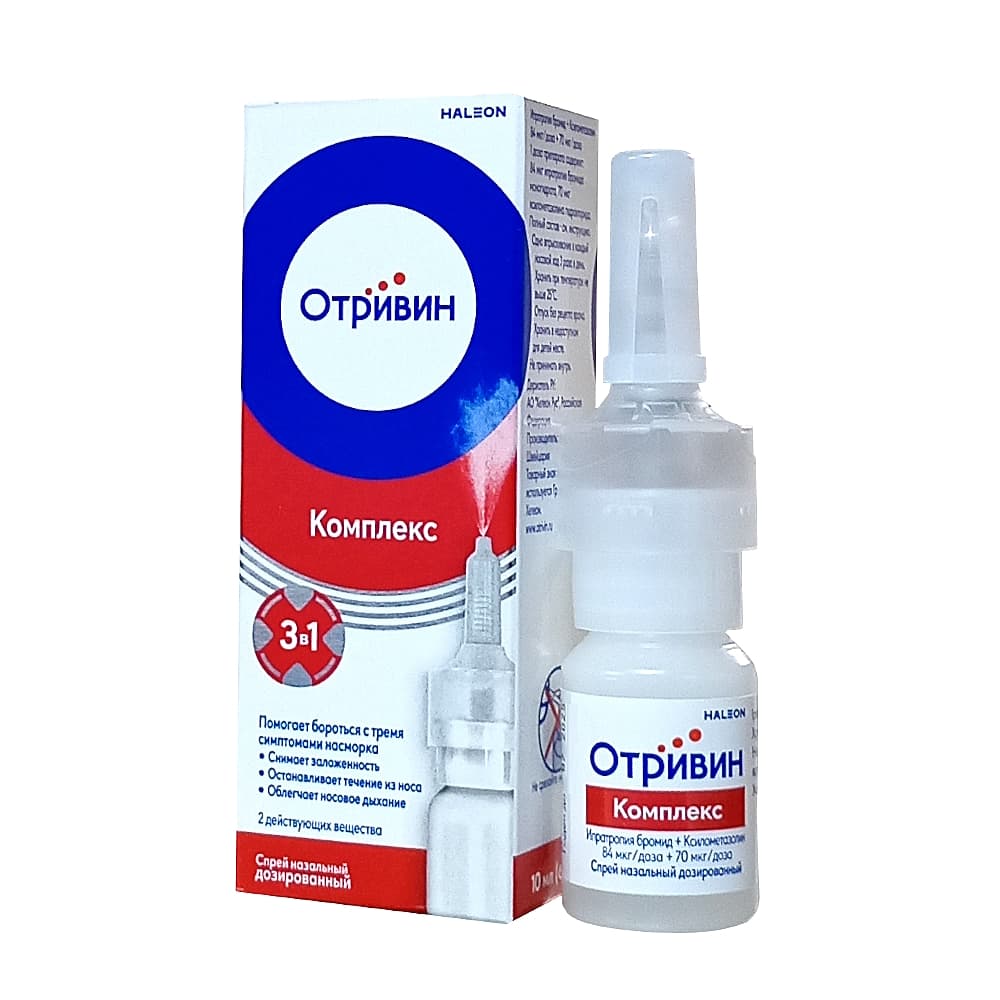 Одно впрыскивание препарата Отривин® Комплекс содержит около 70 мкг ксилометазолина гидрохлорида и 84 мкг ипратропия бромида.