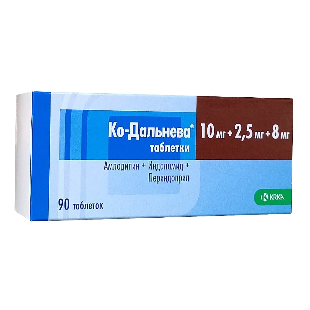 Ко-Дальнева® - комбинированный препарат, содержащий периндоприла эрбумин (ингибитор ангиотензинпревращающего фермента (А11Ф)), индапамид (тиазидоподобный диуретик) и амлодипин (блокатор "медленных" кальциевых каналов (ВМКК)).