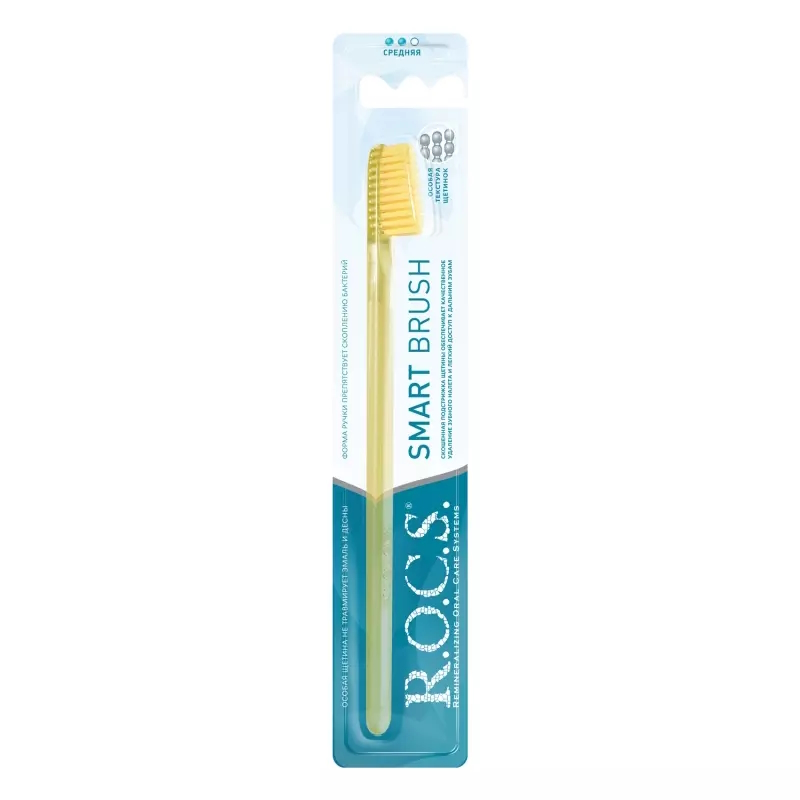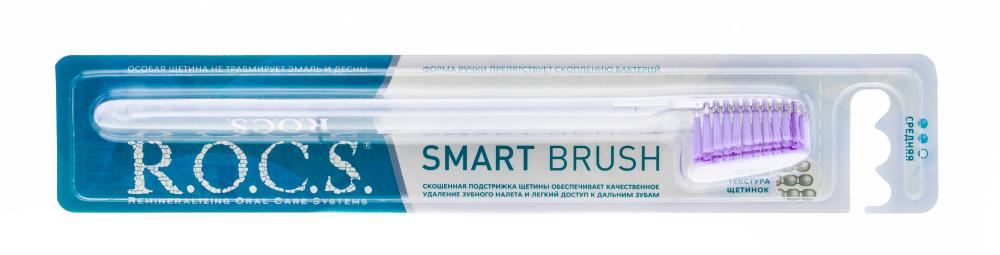 Уникальная форма головки зубной щетки R.O.C.S. - скошенная к концу головки щётки подстрижка щетины - повышает качество чистки поверхности зубов и позволяет с легкостью проникать в труднодоступные участки зубного ряда, а так же качественно очищать пространство между зубами, не повреждая десны. Тонкая плоская прозрачная ручка обеспечивает необычайную маневренность на всех участках зубного ряда.