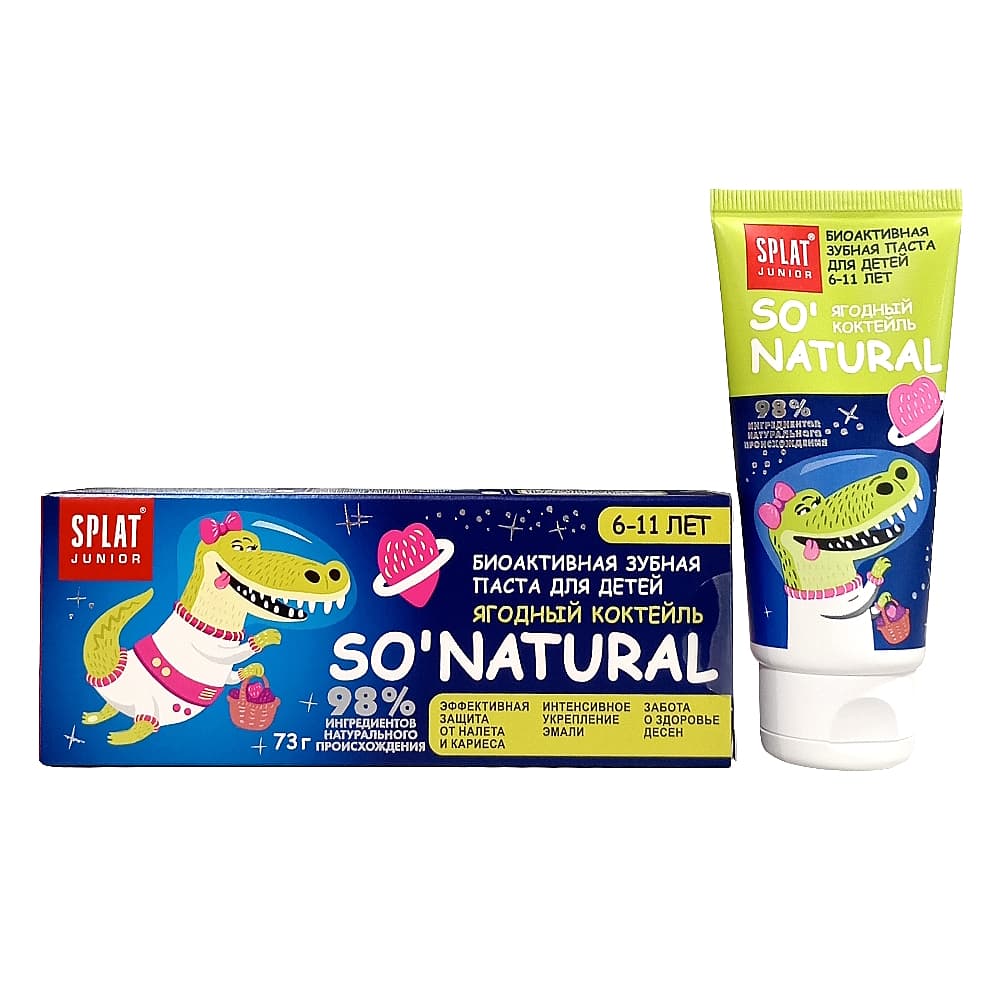 Зубная паста SPLAT® JUNIOR разработана специально для предотвращения кариеса, укрепления эмали и защиты десен от воспалений. Запатентованная система LUCTATOL® на основе экстракта японского лакричника до 96% сокращает образование зубного налета и борется с кариесогенными бактериями, гидроксиапатит кальция обеспечивает интенсивное укрепление эмали детских зубов, а гель Алоэ Вера, экстракты коры магнолии, клюквы и граната, а также витамины А и Е обладают антиоксидантными и противовоспалительными свойствами.