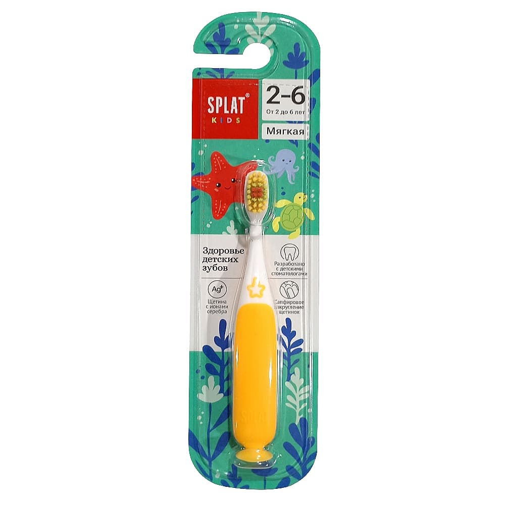 Детская зубная щетка SPLAT Kids 2-6 – бережный уход за зубками вашего ребенка! Прорезиненная ручка эргономичной формы обеспечивает комфортную и безопасную чистку зубов детской рукой, а присоска отвечает за гигиеничное хранение. Мягкая густая щетина бережно очищает эмаль молочных зубов и придесневые зоны Разработано совместно с детскими стоматологами. Детская зубная щетка разработана специально для ухода за полостью рта малышей от 2 лет. Подходит для ежедневной чистки зубов и обеспечивает бережное отношение к чувствительным деснам. Благодаря инновационным технологиям с использованием ионов серебра она помогает поддерживать гигиену на высоком уровне. Мягкие щетинки эффективно удаляют налет, не повреждая эмаль, что особенно важно для детских зубов. Подходит для детей старше 2 лет, помогая формировать полезные привычки ухода за зубами с раннего возраста.