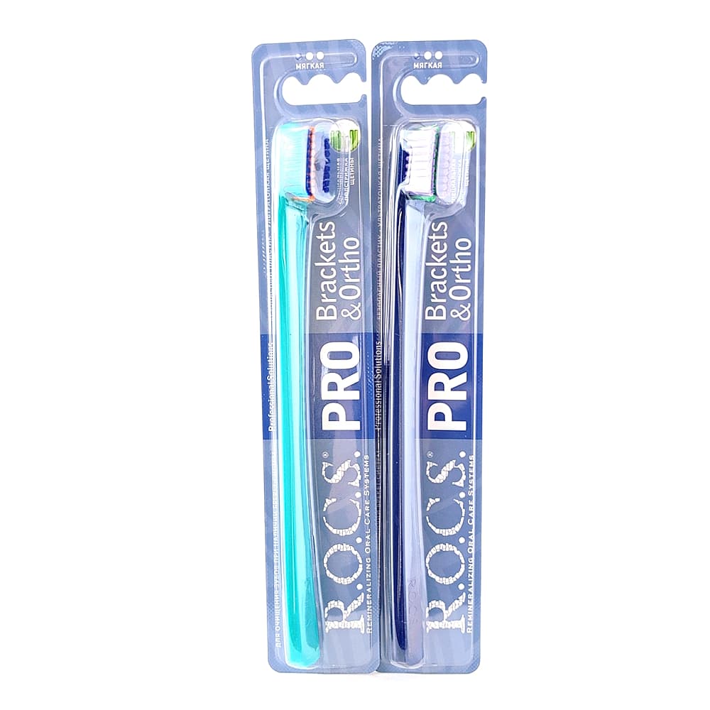 Зубная щетка R.O.C.S. PRO Brackets & Ortho с мягкой щетиной — эффективное решение для ежедневной гигиены при наличии брекет-системы. Специальная двухуровневая подстрижка щетины с углублением в среднем ряду обеспечивает комфортную и качественную очистку зубов в зоне конструкций. 5940 мягких щетинок с треугольным сечением собраны в плотные пучки для увеличения площади чистящей поверхности щетки и эффективности очистки. Уникальная технология тройной полировки кончиков исключает возможность повреждения твердых тканей или десен. Изогнутая шестигранная форма ручки предотвращает избыточное давление на десны. Зубная щетка представлена в четырех цветовых комбинациях. R.O.C.S. — для красоты и здоровья улыбки!