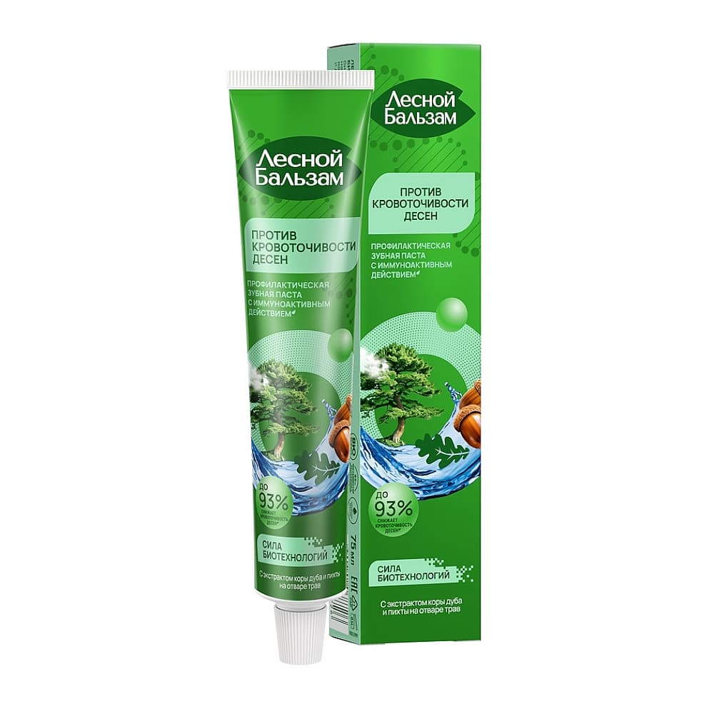 Новая зубная паста Лесной бальзам c иммуноактивным действием помогает решить проблему кровоточивости десен и в 2 раза улучшает работу собственного иммунитета полости рта, снижая риск развития проблем с деснами*.