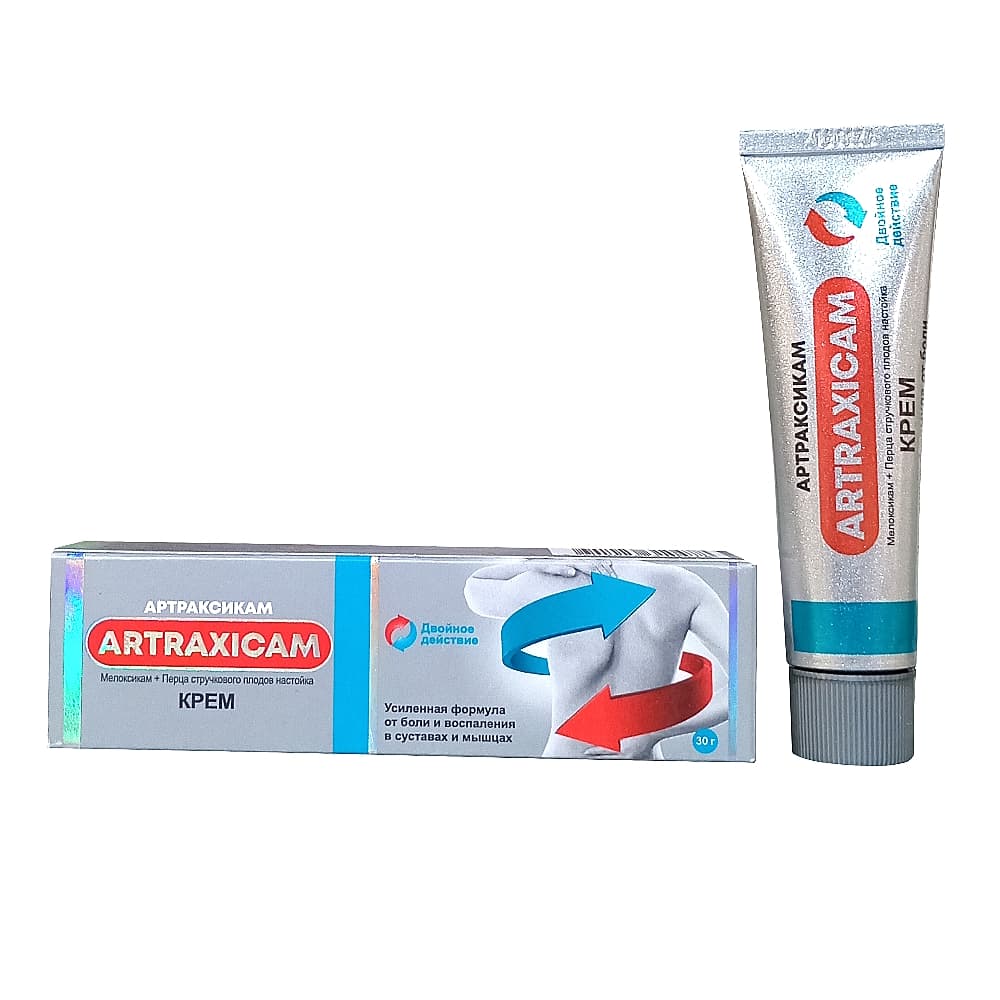 Артраксикам уменьшает боль в суставах (в том числе в суставах позвоночника) и в мышцах в покое и при движении, способствует увеличению объема движения суставов (в области нанесения крема). Уменьшает утреннюю скованность и припухлость суставов. Мелоксикам. избирательно ингибирует циклооксигеназу 2, нарушает метаболизм арахидоновой кислоты, уменьшает в очаге воспаления количество простагландинов (медиаторов боли и воспаления).