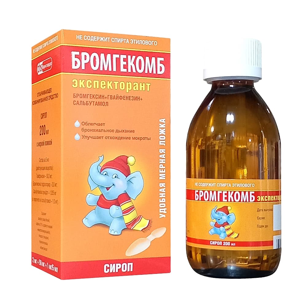 Бромгекомб экспекторант 2 мг + 50 мг + 1 мг/5 мл флакон сироп. 200 мл