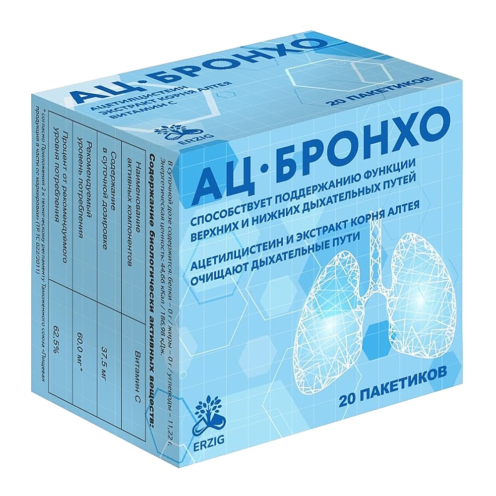 АЦ-БРОНХО содержит сразу 3 активных компонента: ацетилцистеин, экстракт корня алтея и витамин С.