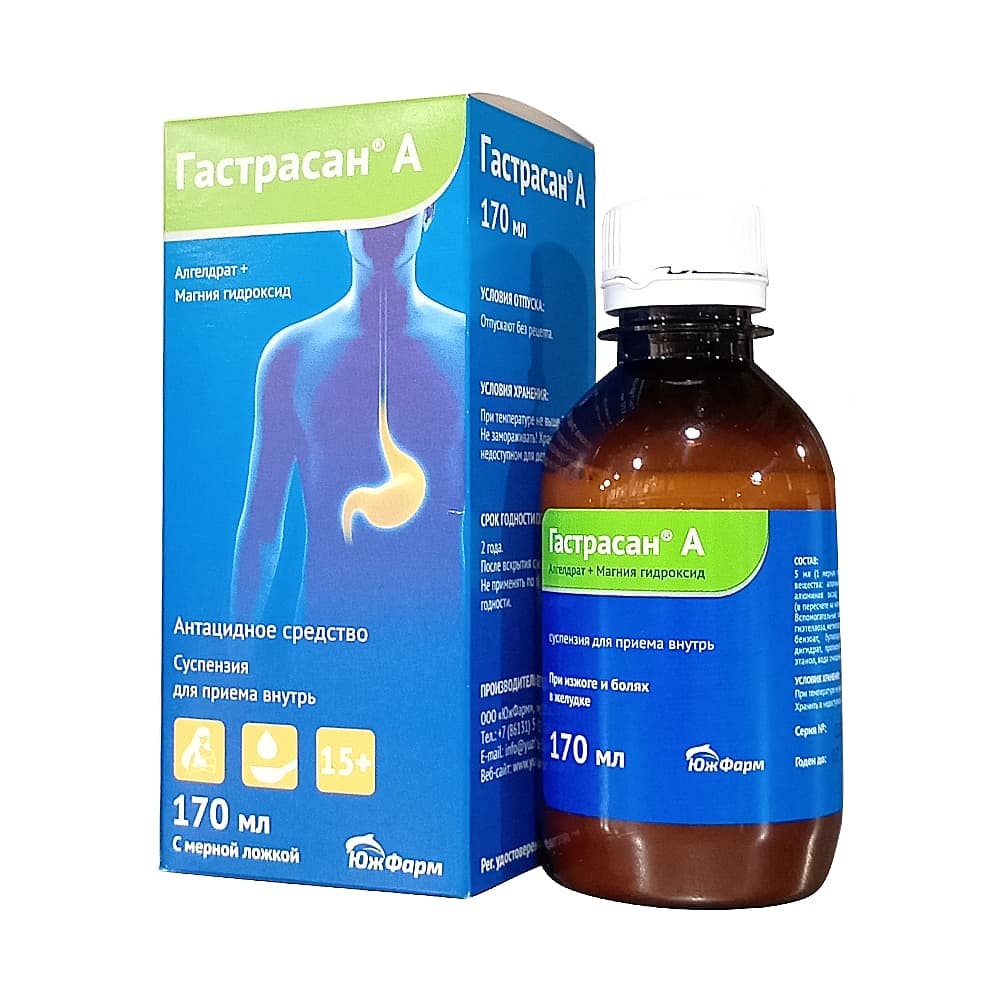 Препарат Гастрасан® А - лекарственное средство, представляющее собой сбалансированную комбинацию алгелдрата (алюминия гидроксида) и магния гидроксида. Он нейтрализует свободную соляную кислоту в желудке, снижает активность пепсина, что приводит к уменьшению переваривающей активности желудочного сока. Оказывает обволакивающее, адсорбирующее действие. Защищает слизистую оболочку желудка за счет стимулирования синтеза простагландинов (цитопротективное действие). Это предохраняет слизистую оболочку от воспалительных и эрозивно-геморрагических поражений в результате применения раздражающих и ульцерогенных агентов, таких как этиловый спирт и нестероидные противовоспалительные препараты (например, индометацин, диклофенак, аспирин, ацетилсалициловая кислота, кортикостероидные препараты).