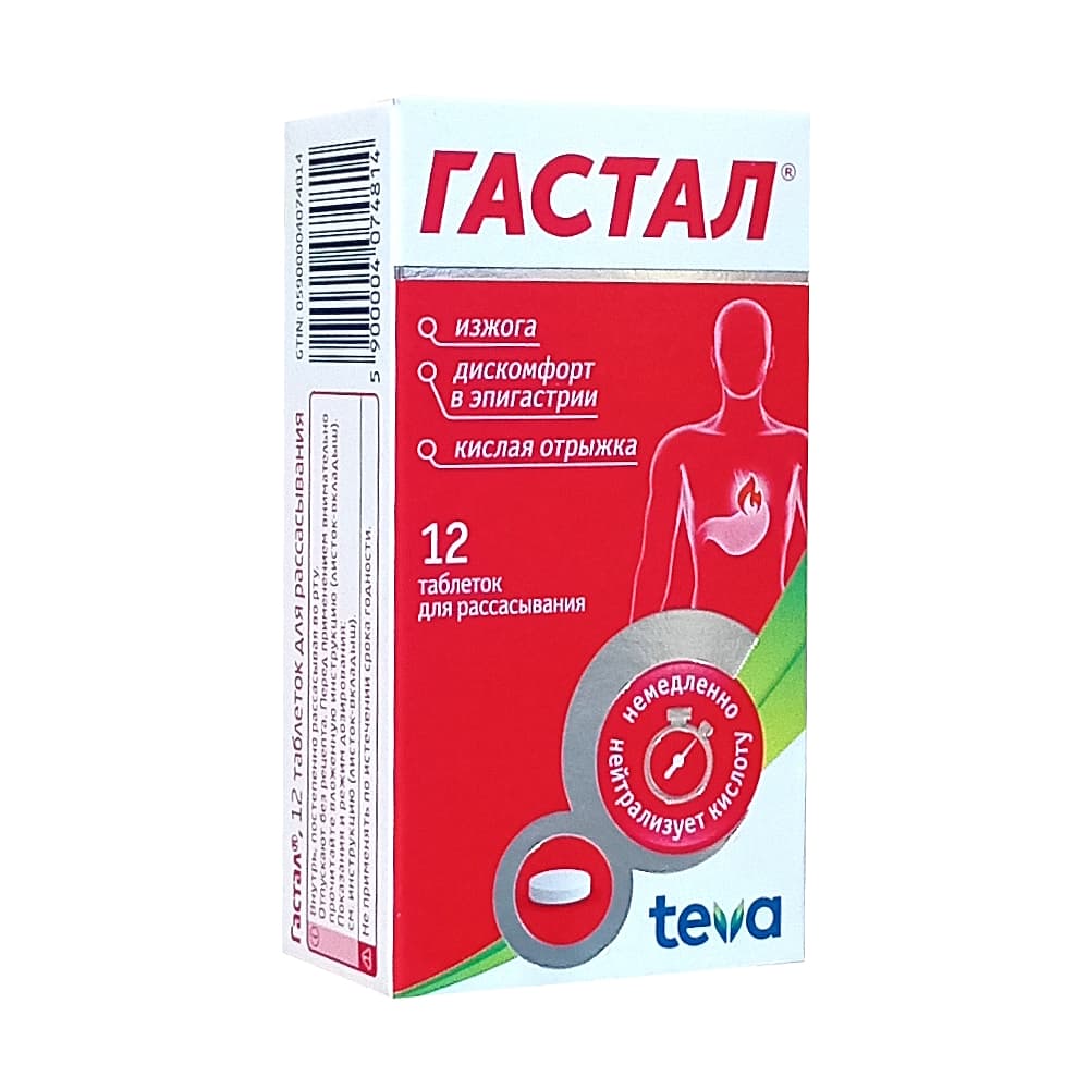 Препарат Гастал® - комбинированное антацидное средство, которое снижает повышенную кислотность желудочного сока и не оказывает стимулирующего влияния на секрецию желудочного сока.Алюминия гидроксида-магния карбоната гель и магния гидроксид обеспечивают немедленную (сразу же после приема) и продолжительную (около 2 часов) нейтрализацию соляной кислоты желудочного сока, с поддержанием кислотности в желудке на физиологическом уровне (pH 3-5). Одна таблетка препарата Гастал® нейтрализует 21,5 ммоль соляной кислоты.