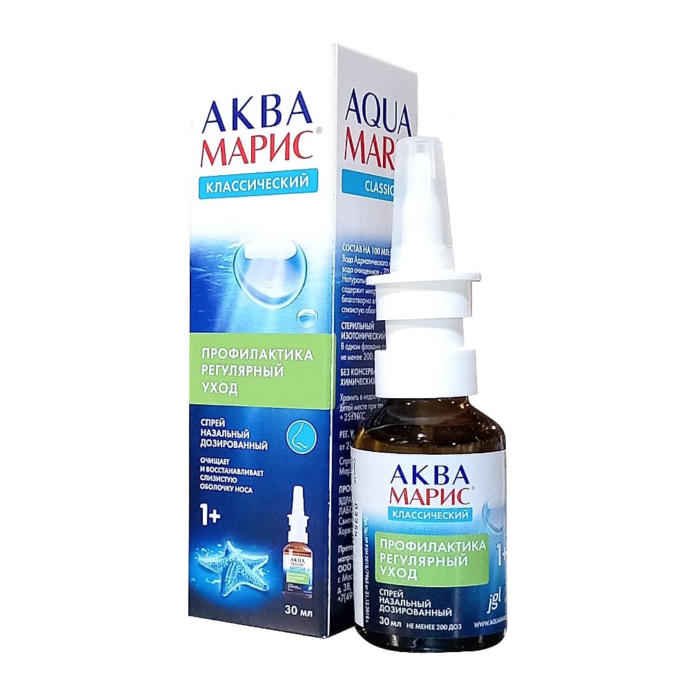 АКВА МАРИС СПРЕЙ НАЗАЛЬНЫЙ КЛАССИЧЕСКИЙ - стерильный изотонический раствор морской воды. Содержание NaCl не менее 9 г/л