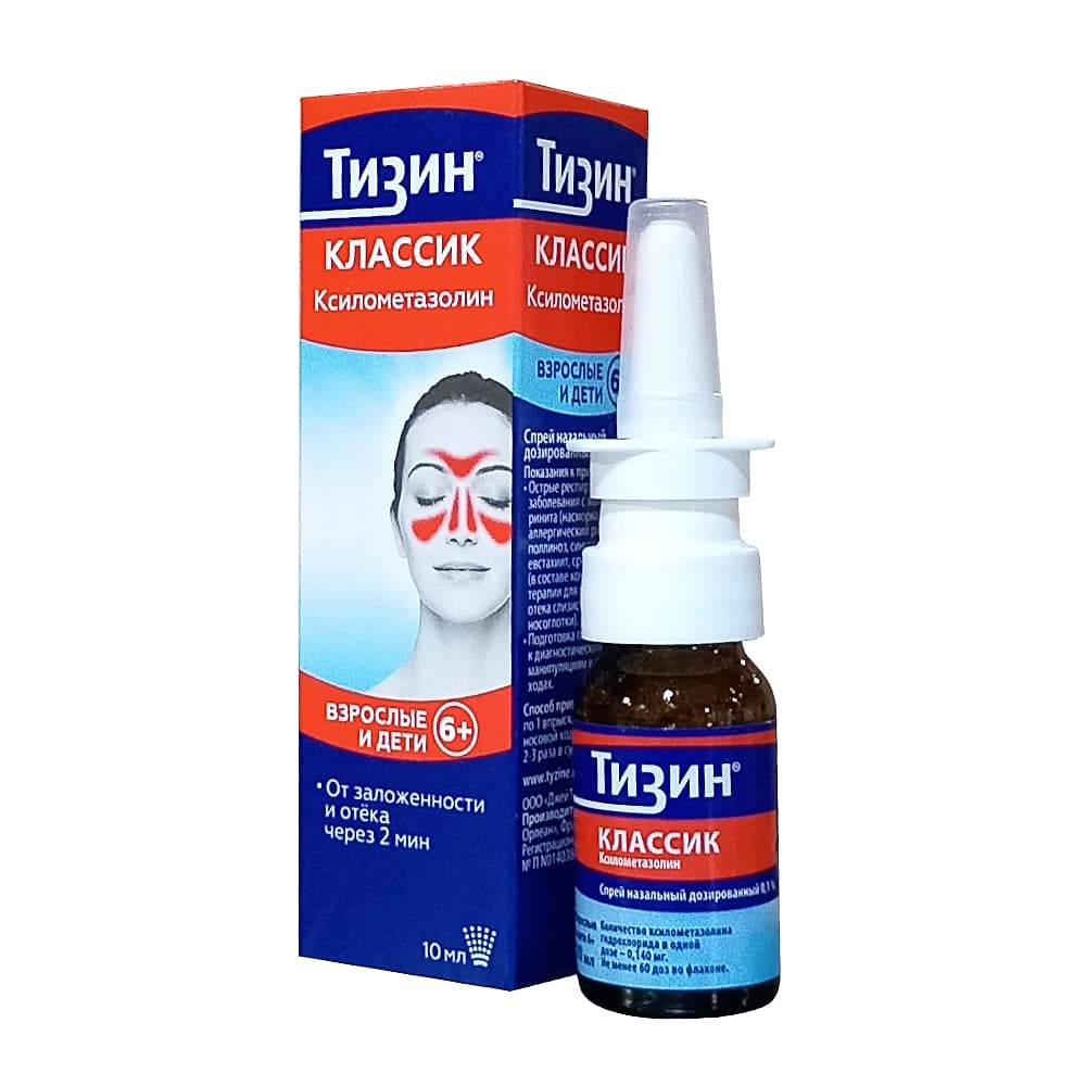 Тизин® Классик в форме спрея назального 0.1% назначают взрослым и детям старше 6 лет по 1 дозе в каждый носовой ход 3 раза/сут.