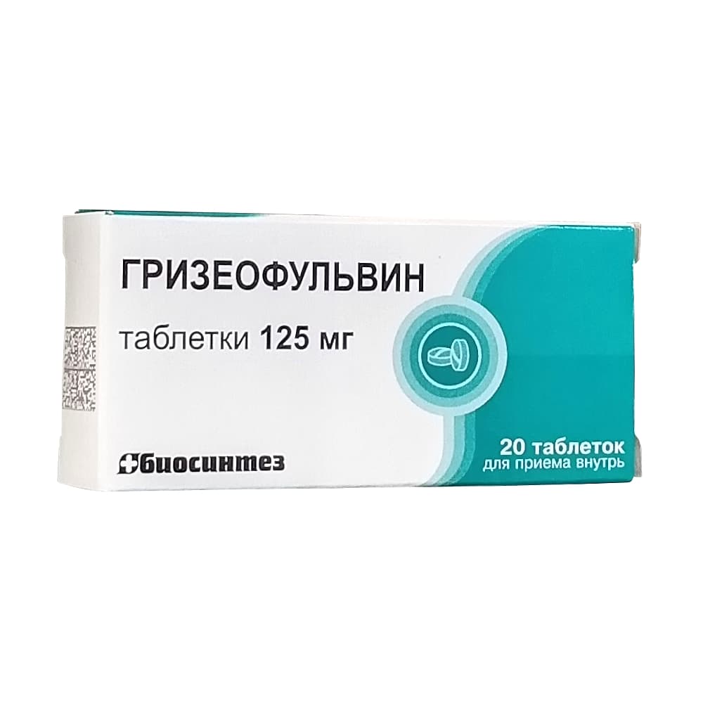 Гризеофульвин таблетки 125мг, 20 шт. Состав: На одну таблетку: Действующее вещество: Гризеофульвин - 125 мг Вспомогательные вещества: лактозы моногидрат (сахар молочный) - 25,56 мг кальция стеарат - 1,80 мг повидон (поливинилпироллидон низкомолекулярный медицинский 12600 ± 2700, К-17) - 3,78 мг крахмал картофельный - 23,86 мг. Фармакологическое действие: Противогрибковый антибиотик, эффективен в отношении грибов рода Trichophyton, Microsporum, Epydermophyton Achorionum; вызывает нарушение структуры митотического веретена и синтеза клеточной стенки у хитинсодержащих грибов, подавляет деление грибковых клеток в метафазе и синтез белка из-за нарушения связи с матричной рибонуклеиновой кислотой. Накапливается в клетках кожи, волос и ногтей, являющихся предшественниками кератина, делая кератин устойчивым к грибковой инвазии. По мере отделения инфицированного кератина происходит замена его здоровой тканью. Показания: Микозы кожи, волос и ногтей (микроспория, трихофития, фавус, онихомикоз, паховая эпидермофития). Противопоказания: Повышенная чувствительность к гризеофульвину или к любому компоненту препарата, порфирия, системная красная волчанка, волчаночноподобный синдром, системные заболевания крови, лейкопения, органические заболевания печени и почек, печеночная недостаточность, злокачественные новообразования, беременность, период грудного вскармливания, детский возраст до 3-х лет. Способ применения и дозы: Внутрь, во время или после еды, за один или несколько приемов. Взрослым - в суточной дозе 500 мг. При тяжелых микозах дозу увеличивают. Детям - в суточной дозе 10 мг/кг. Продолжительность лечения при тяжелых микозах - до 12 месяцев. Курс лечения при поражении кожи тела - 2-4 недели, волосистой части головы - 4-6 недель, стоп - 4-8 недель, пальцев рук - не менее 4 месяцев, пальцев ног - не менее 6 месяцев. Высшая суточная доза - 1 г. Побочные эффекты: Со стороны нервной системы: головная боль, головокружение, слабость, усталость, бессонница, периферическая нейропатия, нарушение координации движений, дезориентация, парестезии конечностей, спутанность сознания. Со стороны пищеварительной системы: тошнота, рвота, диарея, гастралгия, кандидозный стоматит, гепатит. Со стороны органов кроветворения: гранулоцитопения, агранулоцитоз, лейкопения. Аллергические реакции: крапивница, кожная сыпь, зуд, отек Квинке, фотосенсибилизация, волчаночноподобный синдром, мультиформная экссудативная эритема, токсический эпидермальный некролиз (синдром Лайелла). При распространенных высыпаниях проводят десенсибилизирующую терапию. Если высыпания будут нарастать гризеофульвин следует отменить на 3-4 дня. После исчезновения высыпаний антибиотик назначают вновь, но начинают с 1/2 таблетки в день, а затем дозу постепенно повышают до первоначальной в течение 3-4 дней. Взаимодействие: Усиливает действие этанола. Снижает активность эстрогенсодержащих пероральных контрацептивов, антикоагулянтов непрямого типа действия вследствие индукции микросомальных ферментов печени. Барбитураты и примидон уменьшают противогрибковую активность. Дополнительно: Вследствие отрицательного влияния на репродуктивную функцию (как у мужчин, так и у женщин) необходимо использовать эффективные негормональные методы контрацепции. Гризеофульвин системного действия не применяют для лечения инфекций легкой степени тяж