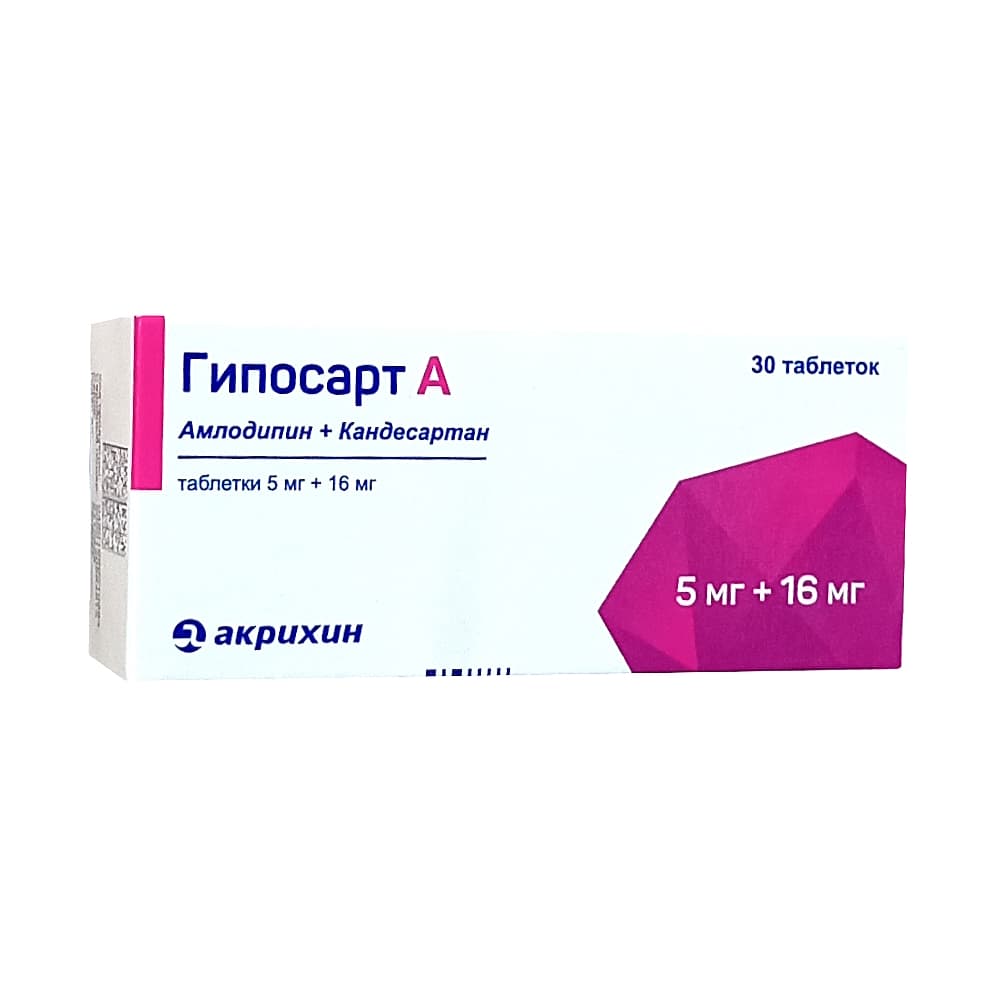 Препарат Гипосарт А - гипотензивное (снижающее уровень артериального давления) комбинированное средство (антагонист рецепторов ангиотензина II + блокатор «медленных» кальциевых каналов).