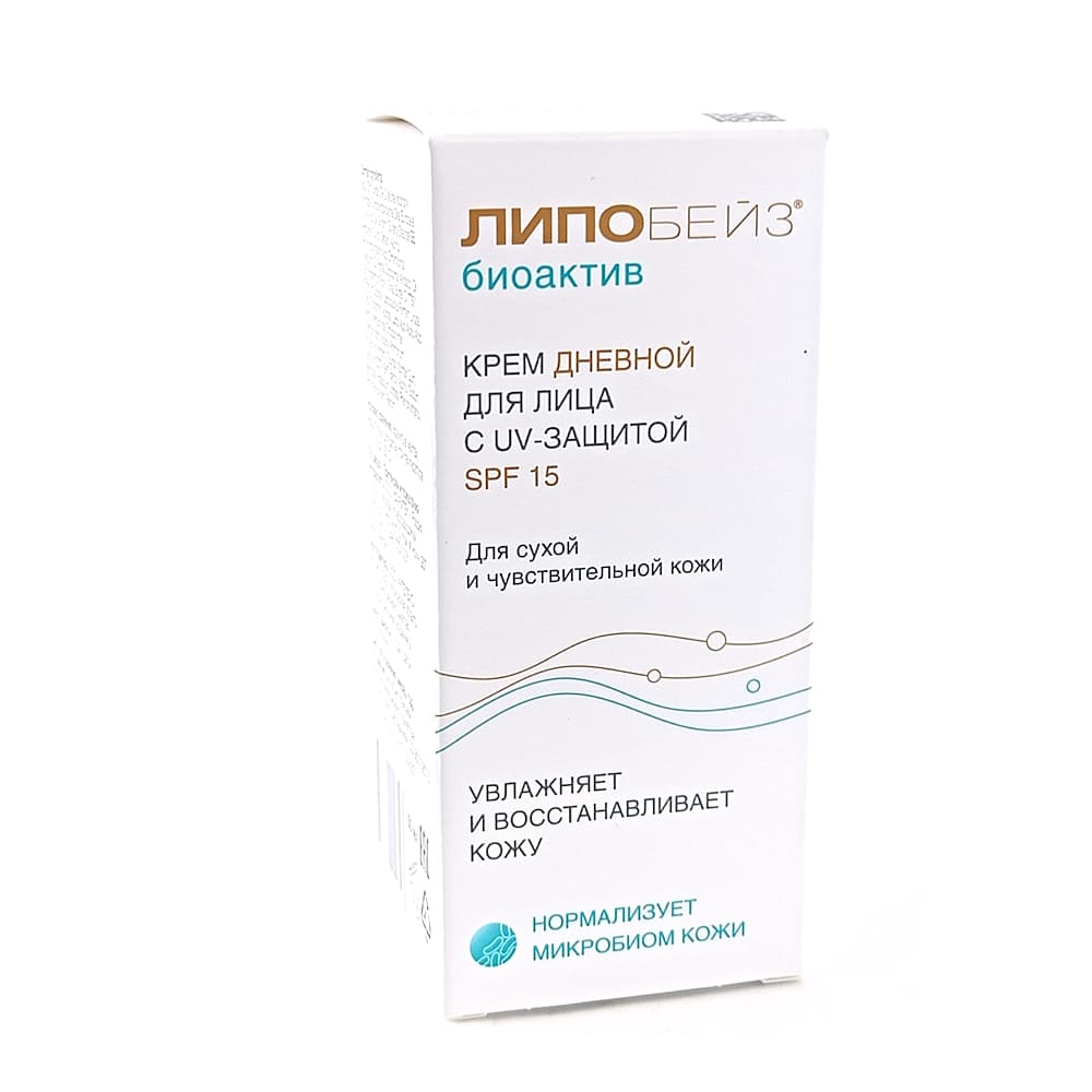 Дневной крем для лица от ЛИПОБЕЙЗ Биоактив с SPF 15 сочетает в себе ухаживающие компоненты и защиту UVA/UVB-излучения на основе оксида цинка и диоксида титана (наиболее эффективных физических (минеральных) фильтров), которые признаны безопасными, в том числе для малышей и обладателей чувствительной кожи.
