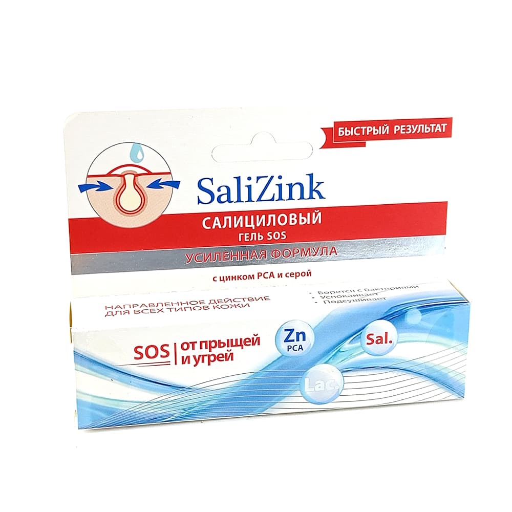 Гель SOS SaliZink применяется для точечного воздействия на прыщи. Активные компоненты в составе борются с бактериями, провоцирующими акне, успокаивают кожу и подсушивают воспаления.