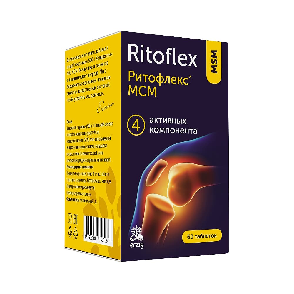Ритофлекс® МСМ (Глюкозамин500+Хондроитин400 МСМ) является надежной основой профилактики заболеваний опорно-двигательного аппарата и необходимой составляющей ежедневного рациона людей, страдающих заболеваниями суставов и позвоночника.