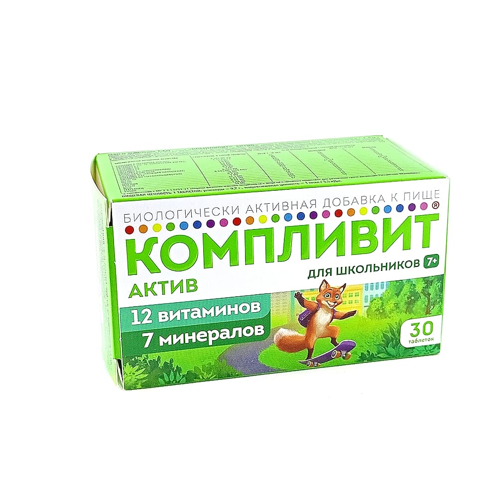Биологически активная добавка к пище "Компливит Актив" является дополнительным источником витаминов А, С, Е, D (в 1 таблетке 200 МЕ), группы В (В1, В2, В3, В5, В6, В12, фолиевой кислоты), минеральных элементов (железа, меди, цинка, селена, йода, марганца), содержащей магний.