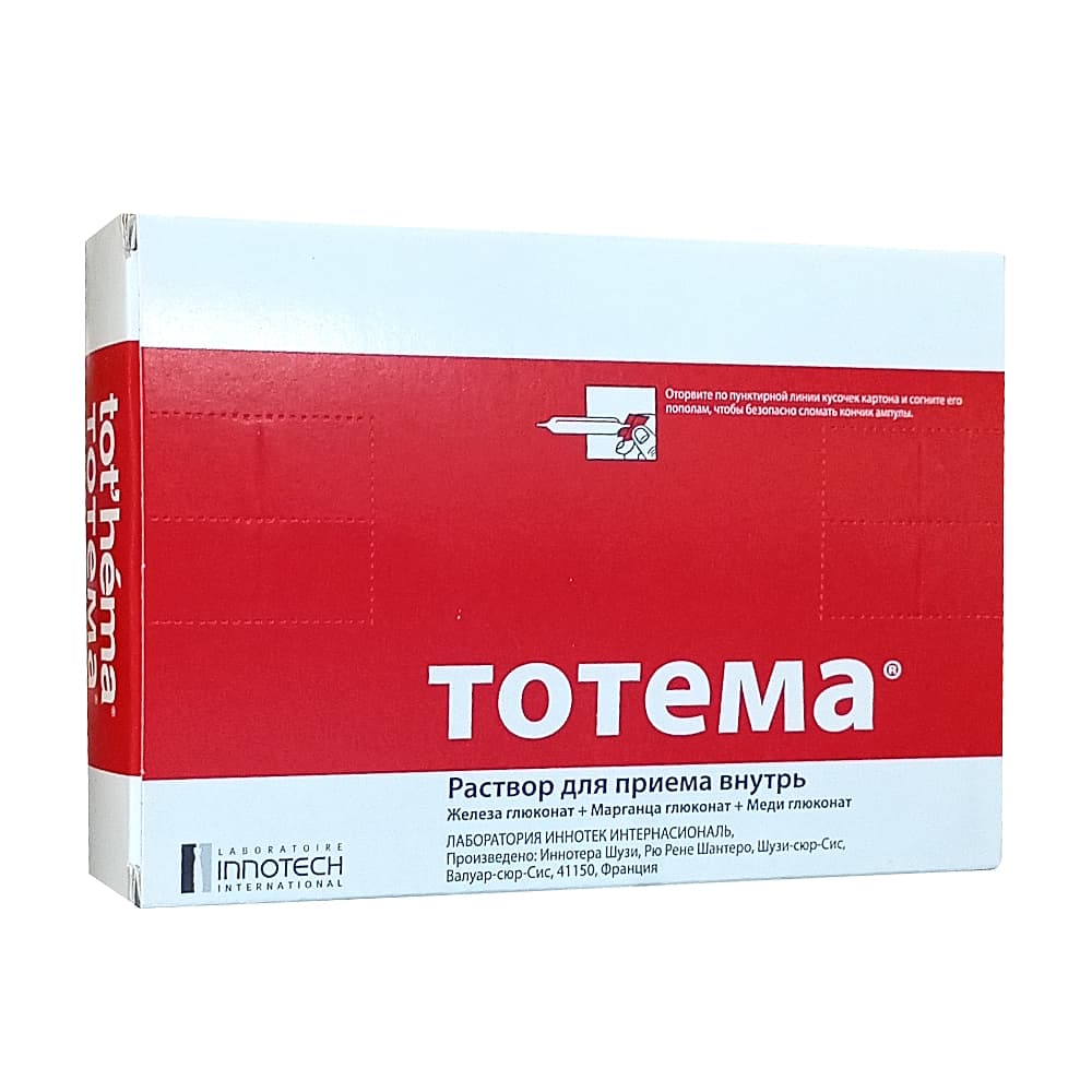 Тотема® - комбинированный антианемический препарат, содержащий двухвалентное железо в виде органической соли железа глюконата, а также марганца глюконат и меди глюконат.
